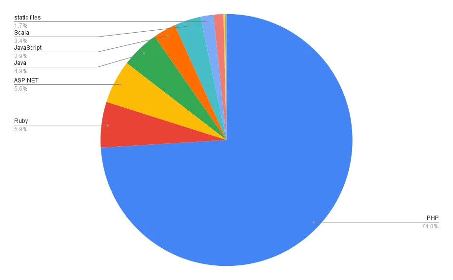 Meet the modern-day COBOL of the web: PHP and its sidekick, WordPress. Powering approximately 43% of all websites, WordPress is a titan in the internet’s infrastructure. A significant portion of e-commerce relies on WooCommerce, a WordPress plugin, further cementing its importance. PHP powers 74% of the web!